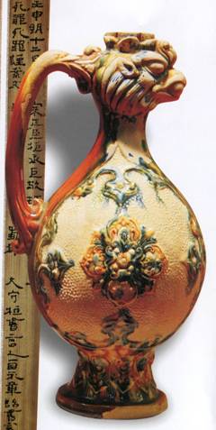 1972年出土于新兴镇杨家庄唐墓。高三十一厘米,胎呈白色,直口、细颈,口颈相交处作一凤首,喙张噙珠,神姿英发,椭圆腹,高圈足,凤冠伸至后腹为柄,器身各部位交错施绘赭红、黄、青三种釉色,流光溢彩。风首壶器形受古代波斯金银器型影响。而三彩釉工艺和凤鸟形象则是唐文化的表现,是融合东西方艺术风格为一体的典型器物,实物现存甘肃省博物馆。