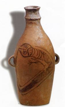 1957年出土于甘谷县西坪乡石坪村仰韶文化遗址,引起考古界极大关注。彩陶瓶圆腹平底,腹有对耳,小口平沿。颈部有附加堆坟一周,砖红色瓶体施黑彩。对比强烈,色泽明快。图案绘有人面鲵身形象,额头上有十字纹与几道横纹,颈部有弧线纹饰,腹部施网纹,两前肢向外伸出,尾部翘起至头顶。其外表似鲵。是新石器时代仰韶文化庙底沟类型陶器中一件人面鲵身纹的彩陶器,距今5500年左右。该器物对研究龙图腾原始形象提供了实物资料。2001年6月12日,中国、比利时联合发行了《陶瓷》邮票一套两枚,其中一枚即为人面鲵鱼彩陶瓶图案。